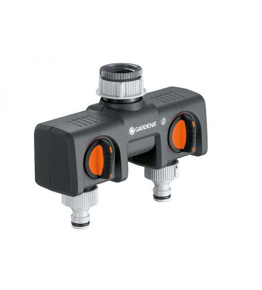 Voor gebruik twee aansluitapparaten. Waterdoorvoer reguleer- en afsluitbaar. Voor 26,5 mm (G 3/4) waterkraan met 33,3 (G 1) draad en voor 21 mm (G 1/2) waterkraan met 26,5 (G 3/4) draad. Geschikt voor 2 Gardena besproeiingscomputers of watertimers.