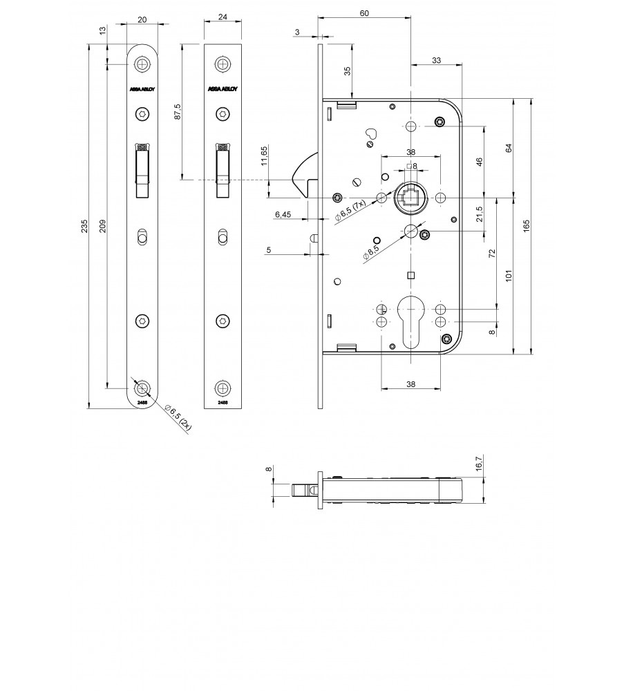LIPS Schuifdeurslot, badkamer, DM60mm, WC72mm, krukgat 8mm, voorplaat RVS 24x235mm RECHTHOEKIG
