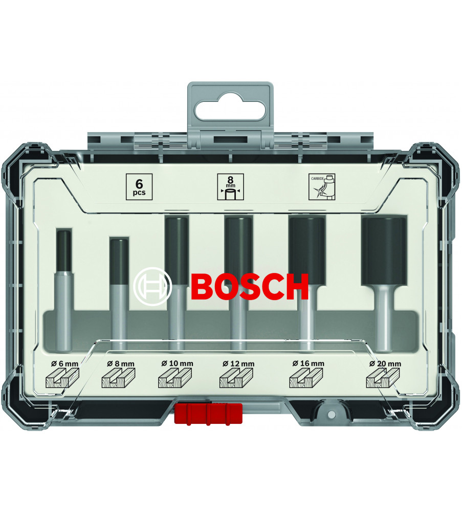 De freesset biedt fijne resultaten voor uiteenlopende toepassingen en is de perfecte keuze voor houtbewerkers zoals schrijnwerkers, timmerlui, interieurinstallateurs en bouwvakkers. De hardmetalen snijkanten van de frezen zorgen voor een lange levensduur. Tevens is het mogelijk om diverse profielen in veel verschillende materialen te frezen dankzij de uiteenlopende geometrieën. De frezen zijn ontworpen conform de veiligheidsnorm van DIN EN-847. De frezen zijn bedoeld voor gebruik in zachthout, hardhout en houtcomposieten. De 6-delige rechte freesset bevat een selectie van de meest voorkomende rechte frezen voor groeven en sponningen. De freesset heeft een speciaal Easy Pick ontwerp, zodat de frezen snel en veilig door de schacht opgenomen kunnen worden. De set wordt geleverd in een exclusieve en zeer robuuste draagkoffer waarin de frezen veilig kunnen worden opgeslagen en getransporteerd. De koffer is doorzichtig, zodat u de inhoud kunt zien. De set is beschikbaar in drie uitvoeringen: met een schachtdiameter van 6 mm, 8 mm of 6,35 mm (¼ inch) voor compatibiliteit met alle veelgebruikte handbovenfrezen.