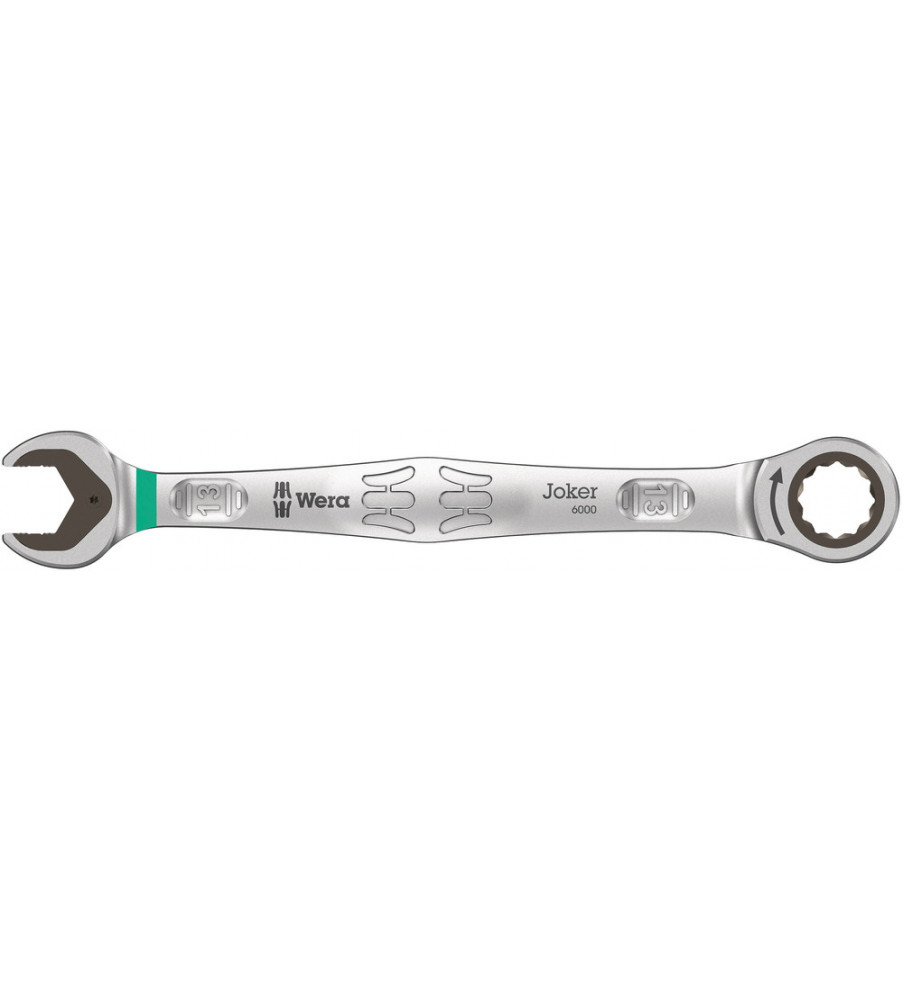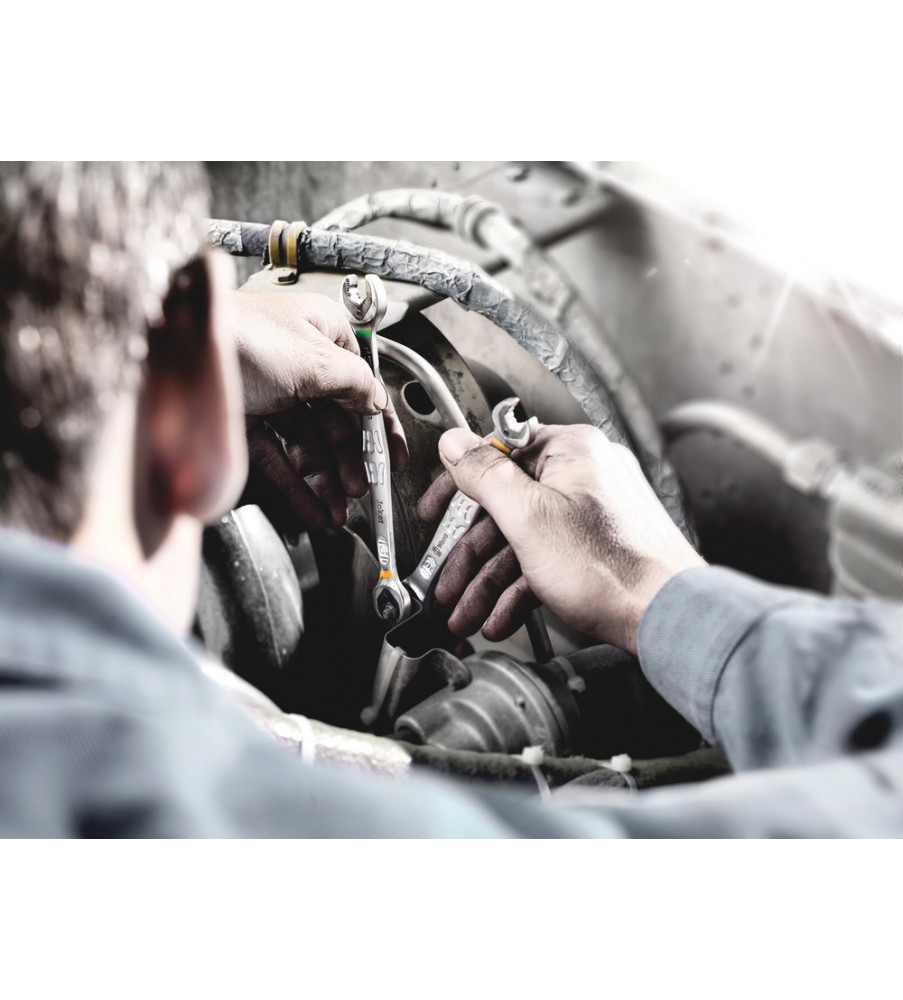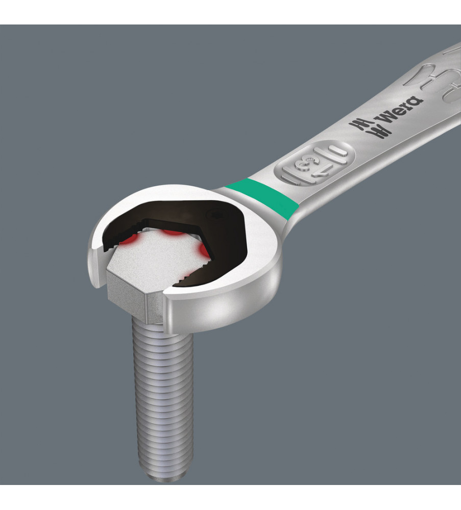 Hoogwaardige, metrische ringratel-steeksleutels van Wera: Alles wat een sleutel moet kunnen. En nog veel meer. Sneller, beter, mooier. Kortom: een echte Joker. De nieuwe generatie steek-ringratelsleutels. Voor zeskantschroeven en -moeren. Met vasthoudfunctie via metalen plaat in bek om schroeven en moeren niet te verliezen. De verwisselbare metalen plaat in de bek houdt met extra harde tanden schroeven en moeren vast en verkleint het risico op wegglijden. De geïntegreerde eindaanslag voorkomt het wegglijden naar beneden van de schroefkop en maakt hoge draaimomenten mogelijk. De intelligente dubbele zeskant-geometrie zorgt voor een sluitende verbinding met schroef of moer en vermindert zo het risico op wegglijden. Dankzij de terughaalhoek van slechts 30° behoort het tijdrovende omkeren van de sleutel tijdens het schroeven tot het verleden. Ratelmechanisme aan de ringzijde met uiterst fijne vertanding (80 tanden) voor flexibiliteit, ook op plekken waar weinig plaats is. De speciale smeedvorm maakt de overbrenging van hoge draaimomenten mogelijk en geeft het geheel een hoge buigstijfheid. Gemaakt van sterk chroom-molybdeen staal met nikkel-chroom coating voor een hoge bescherming tegen corrosie. Met "Take it easy toolfinder": Kleurcodering op maat.