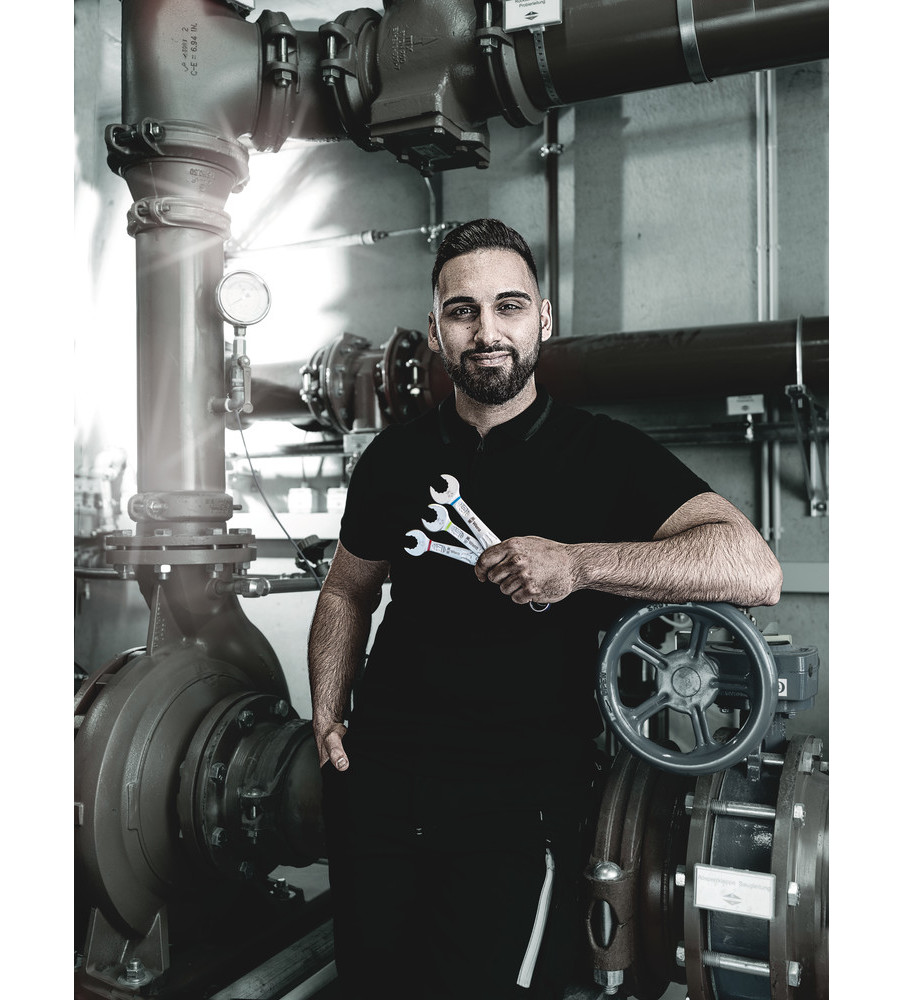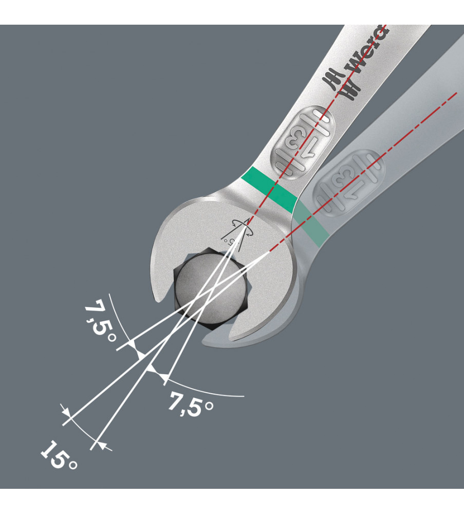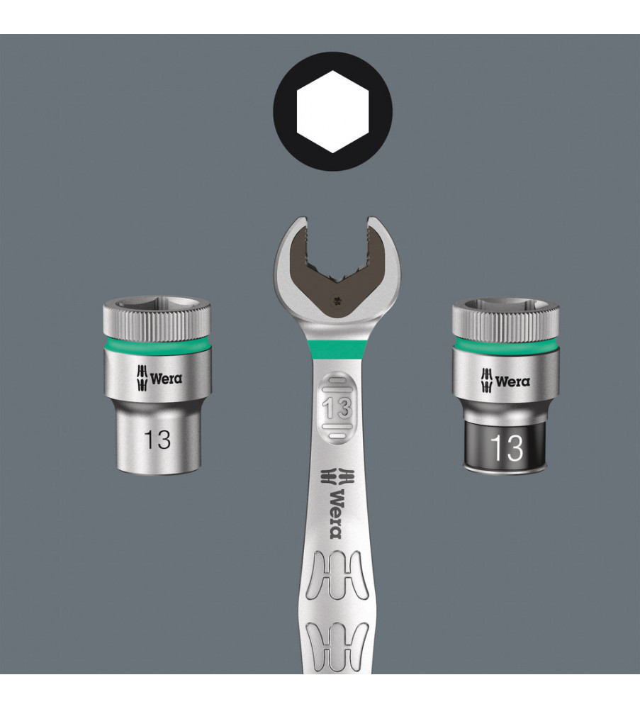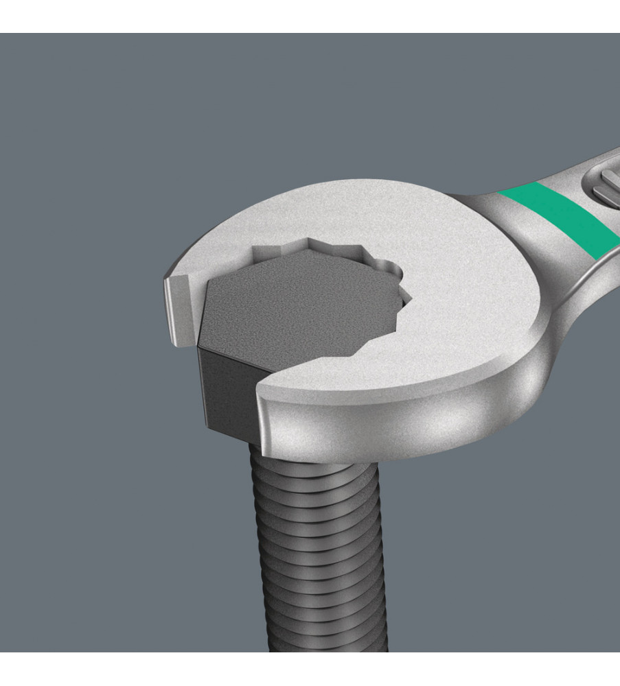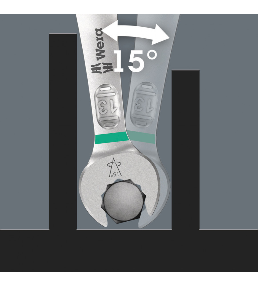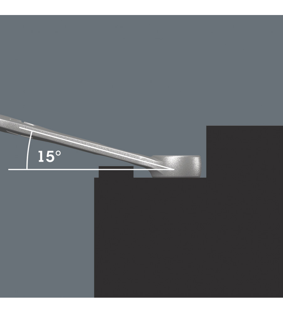 Aangezien ruimtes waarin geschroefd moet worden, steeds krapper worden, is gereedschap vereist waarmee de gebruikers ook in dergelijke situaties goed uit de voeten kunnen. Krappe ruimtes vereisen extra aanzetpunten voor het gereedschap. Laten steeksleutels zich dan ook zodanig aanpassen dat er meer aanzetmogelijkheden komen? Door de bek 7,5° te buigen en een dubbelzeskantgeometrie toe te passen, kon het aantal aanzetpunten worden verdubbeld. Bij meermaals verdraaien van de sleutel over 180° over de lengte-as tijdens het schroeven beschikt de gebruiker over vier aanzetmogelijkheden en kunnen moeren resp. schroefkoppen elke 15° worden 'vastgegrepen'. De Joker 6003 met zijn slimme bekgeometrie vergroot het aantal toepassingsmogelijkheden in krappe ruimtes aanzienlijk. De Joker 6003 vindt als het ware het meest geschikte aanzetpunt na elke omwenteling vanzelf. De slanke en toch robuuste ringzijde maakt een hoek van 15° tot de gereedschapsas. De hoogwaardige coating zorgt voor een langdurige en hoge corrosiebescherming. Met 'Take-it-Easy' Toolfinder: Kleurcodering op maat. De Joker etuis kunnen dankzij klittenband aan de achterzijde worden bevestigd aan wanden, rekken, gereedschapswagens en het Wera 2go systeem.