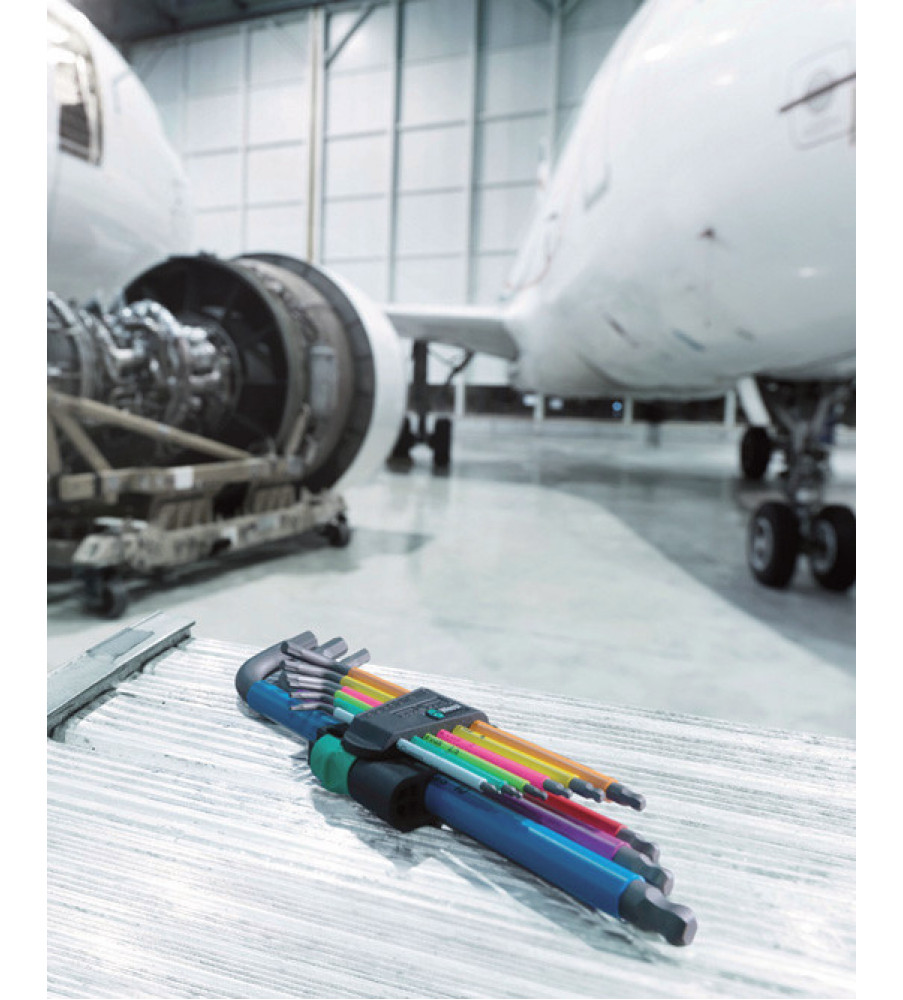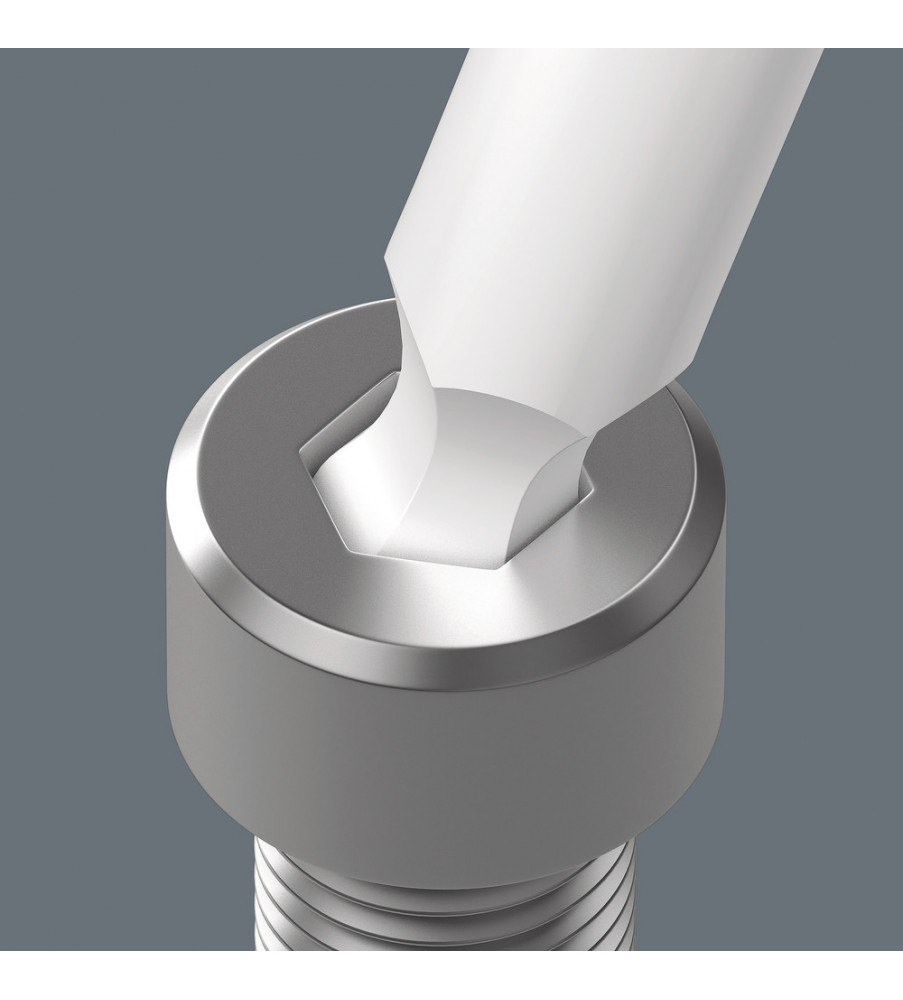 Hoogwaardige Wera stiftsleutel met kleurgecodeerde, comfortabele rubberen ommanteling. Zo heeft u het juiste gereedschap snel te pakken, terwijl de ergonomische en aangenaam aanvoelende greep de handen spaart bij lage temperaturen. Onverslijtbaar clip-materiaal voor duurzaam veilige grip op de stiftsleutels; sleutels makkelijk uit clip te nemen. Het Hex-Plus-profiel is voorzien van grotere contactvlakken met de schroefkop. De kerfwerking en daarmee de deformatie van de schroef worden hierdoor gereduceerd. De kogel aan de lange zijde maakt veilig werken mogelijk, ook in lastige montageposities. De Blacklaser-oppervlakbehandeling zorgt voor een uitstekende oppervlakbescherming, ook tegen corrosie, en een lange levensduur. Ingelaserde en dus wrijfvaste formaatmarkering op de stiftsleutels om snel de juiste sleutel te kunnen vinden.