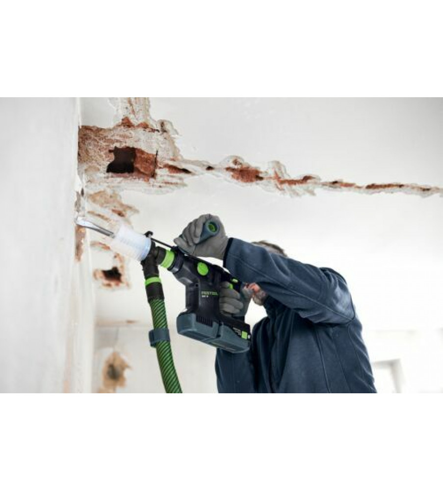 Stofarm hamerboren mogelijk voor plafondwerkzaamheden zonder stofzuiger. Om de afzuigvoorziening om te vormen tot een stofopvangreservoir sluit je gewoon de mof met de afsluitdop