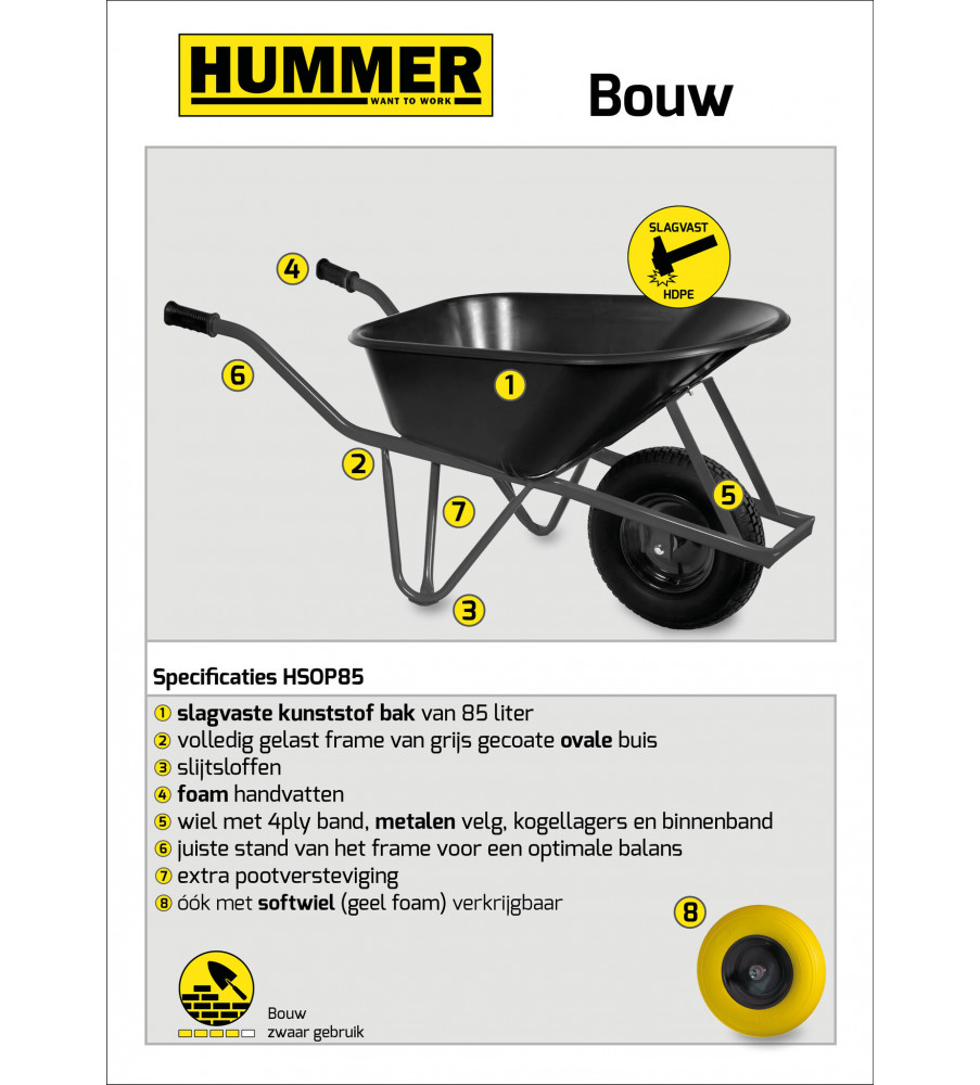 Slagvaste kunststof HDPE bak van 85 liter. Volledig gelast frame van grijs gecoate ovale buis in RAL 7037, voorzien van slijtsloffen en foamgrip handvatten. Wiel 400x8 met metalen velg, kogellagers en gele foamband.