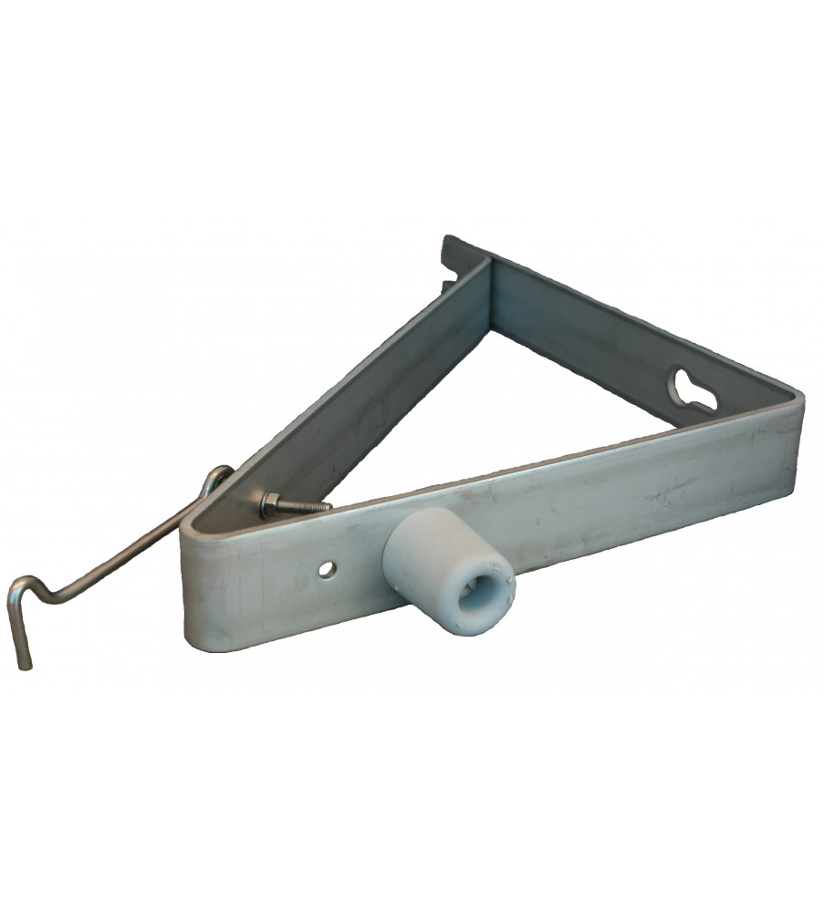 Deuropvangbeugel, driehoekig model. Geschikt voor montage aan de buitenmuur om een naar buiten draaiende deur op te vangen. Inclusief deurbuffer en windhaak.