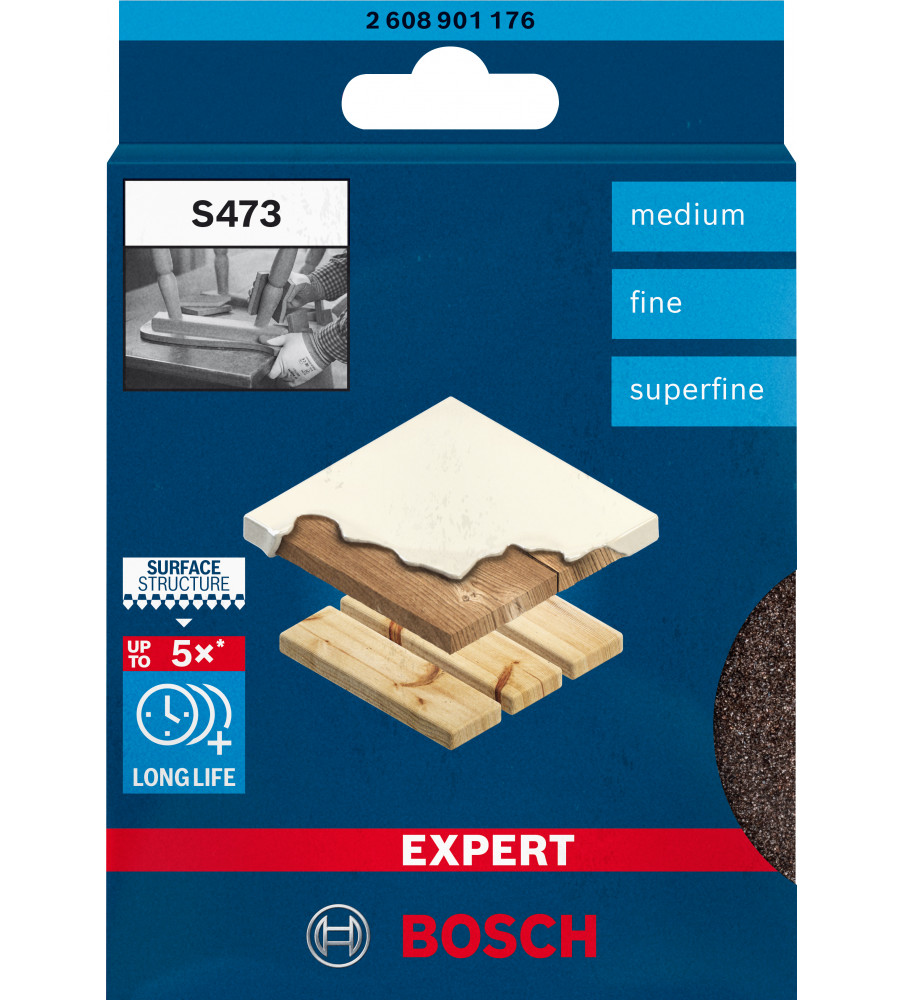 De Surface Structure is een combinatie van geavanceerde verbinding- en oppervlaktecoatingtechnieken om de korrels op het rugmateriaal te bevestigen. Het is zo sterk dat het Bosch Expert Flex schuurschuimpad geen korrels verliest bij het schuren langs randen en hoeken. Het minimaliseert ook verstopping en stof kan eenvoudig van het flexibele oppervlak worden geveegd of gespoeld. Met gelijkmatige druk vormt het zich ook naar het oppervlak.