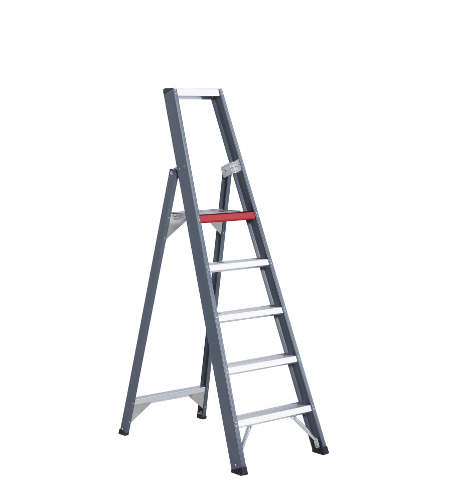 Falco (FEO) enkel oploopbaar. De trap voor professioneel gebruik De Falco is gemaakt voor intensief gebruik. De robuust vormgegeven trap is ideaal voor elke professionele klus. Het zelfontgrendelende scharniersysteem maakt de trap opvallend handig en eenvoudig in gebruik. Snel gepakt, snel weer opgeruimd. De grijze coating is niet alleen stijlvol. Het is bovendien vuilafstotend en geeft niet af aan je handen. Door de schetsschoren en grote voeten weet je zeker dat je stabiel staat. De steunbeugel is niet alleen veilig. Het bakje in de beugel geeft je ook een plek voor je gereedschap.