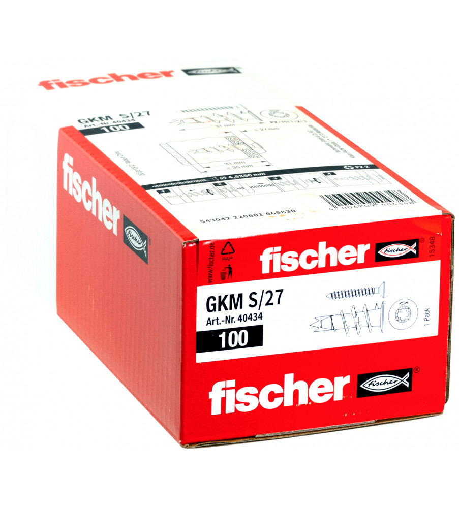 De fischer Gipsplaatplug GKM27 wordt gemaakt van metaal. De plug wordt in de voorsteekmontage met een accuschroevendraaier of met de hand lijnend met het oppervlak in de gipsplaten gedraaid. In enkelvoudige gipsplaten hoeft niet te worden voorgeboord. Bij gipsplaten en of dubbele gipswanden met een boor Ø 8 mm voorboren. De fischer GKM27 wordt compleet met spaanplaatschroef met verzonken kop geleverd. Daarmee is hij universeel geschikt om lampen en elektrische installaties, decoratie-accessoires betrouwbaar en snel te bevestigen.