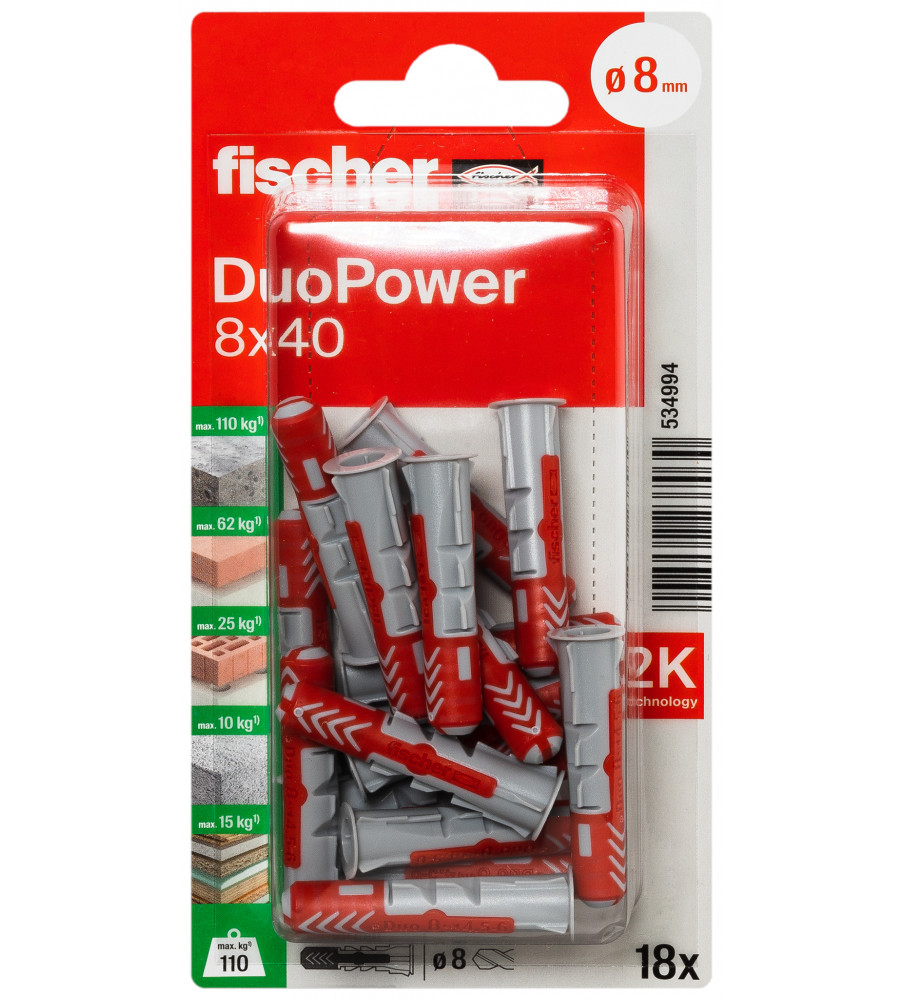 De fischer DuoPower heeft een zeer hoge bevestigingswaarde door de 2 componenten: de grijze component van kwalitatief hoogwaardig nylon activeert, afhankelijk van het bouwmateriaal, automatisch het optimale werkingsprincipe (spreiden, vouwen, knopen) voor het optimaal houvast. De expansievleugels van de rode component ondersteunen de betrouwbare spreiding en biedt extra veiligheid voor de grijze component. De schroef indraaien en tot slot goed „aantrekken“. De bij de kop aangebrachte rand voorkomt dat de plug in het boorgat glijdt.