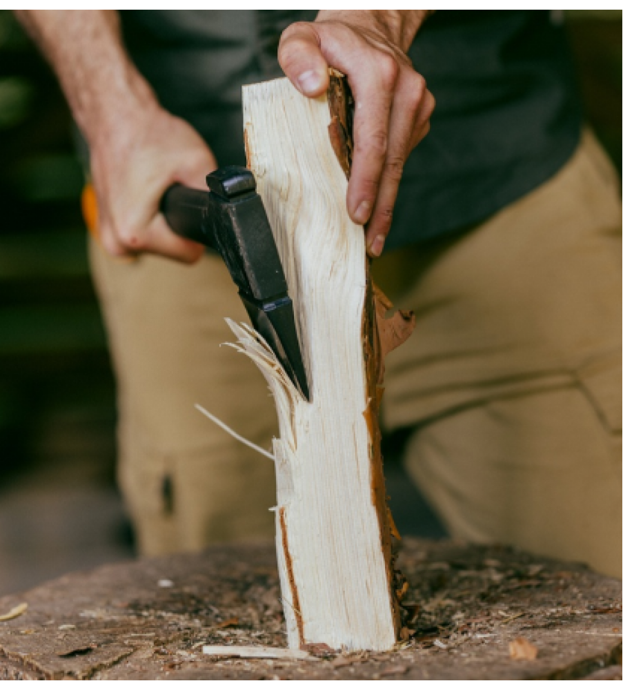 Het blad van de FISKARS X24 bijl is dun en wijd uitlopend, waardoor het makkelijk door vers en harshoudend hout snijdt.