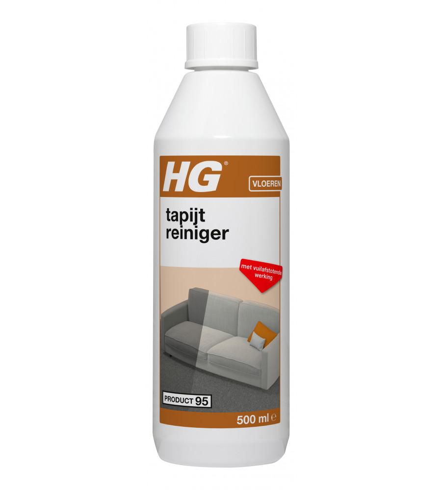 Door het belopen beschadigen bij een synthetisch tapijt de vezels waardoor ze gemakkelijk vuil vasthouden. Met HG tapijt- en bekledingreiniger (HG product 95) wordt het vuil verwijderd en wordt het oneffen vezeloppervlak opgevuld met een vuilafstotend laagje. Ook bij een wollen tapijt gebeurt op den duur iets dergelijks. Het natuurlijke wolvet verdwijnt namelijk langzaam maar zeker. HG tapijt- en bekledingreiniger vult dit weer aan met vuilafstotend materiaal. Behandel de vlekken vooraf met HG vlekkenspray. Daarna HG tapijt- en bekledingreiniger met een speciale machine insproeien en direkt afzuigen of met een borstel inwrijven. Nadrogen met een badstof handdoek. Eén liter is goed voor 30 vierkante meter vloeroppervlak.