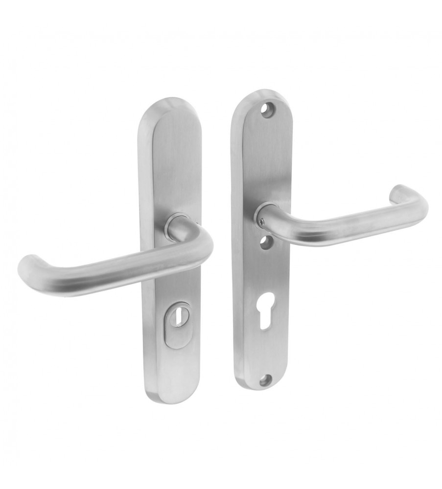 Deze ovale set achterdeurbeslag is voorzien van zowel een kruk aan de buitenzijde als een kruk aan de binnenzijde en is zowel links als rechts toepasbaar. Het veiligheidsbeslag is geveerd en heeft een profielcilindergat maat van 72 mm en is vervaardigd uit roestvast staal. Door het gebruik van massief rvs heeft dit product een lange levensduur en door de geborstelde behandeling heeft het product een matte uitstraling. Het veiligheidsbeslag is voorzien van kerntrekbeveiliging, waardoor de cilinder wordt beschermd tegen het uittrekken en uitboren van de cilinderkern. Kerntrekbeveiliging is sinds eind 2013 verplicht in nieuwbouw en sinds april 2014 ook voor bestaande bouw. Het veiligheidsbeslag is SKG*** gekeurd, wat betekent dat het om extra zwaar inbraakwerend beslag gaat.
