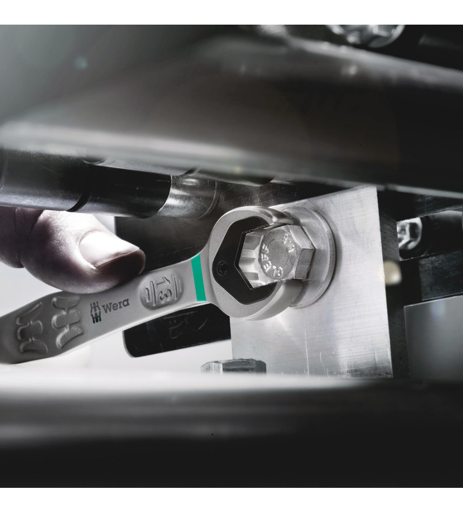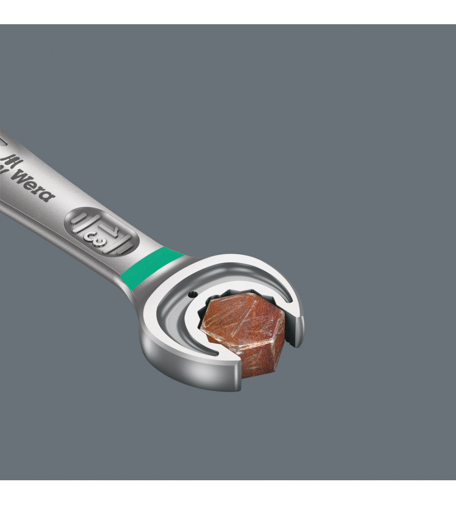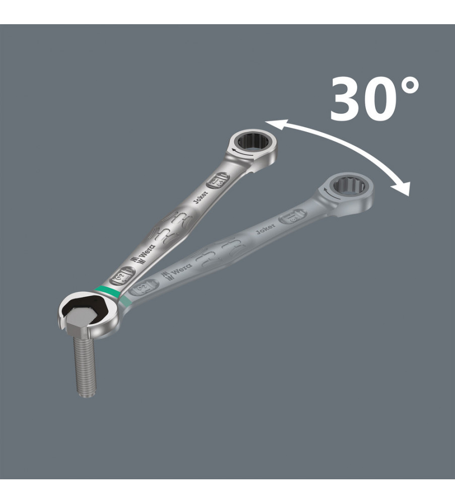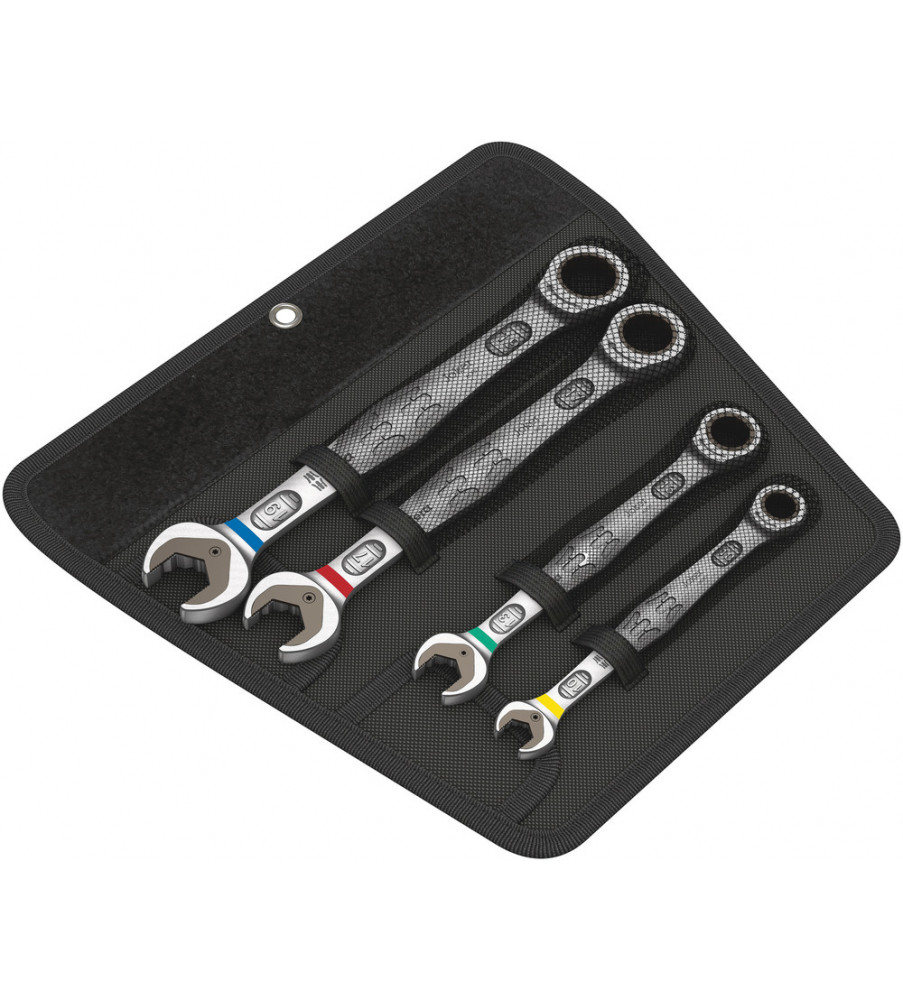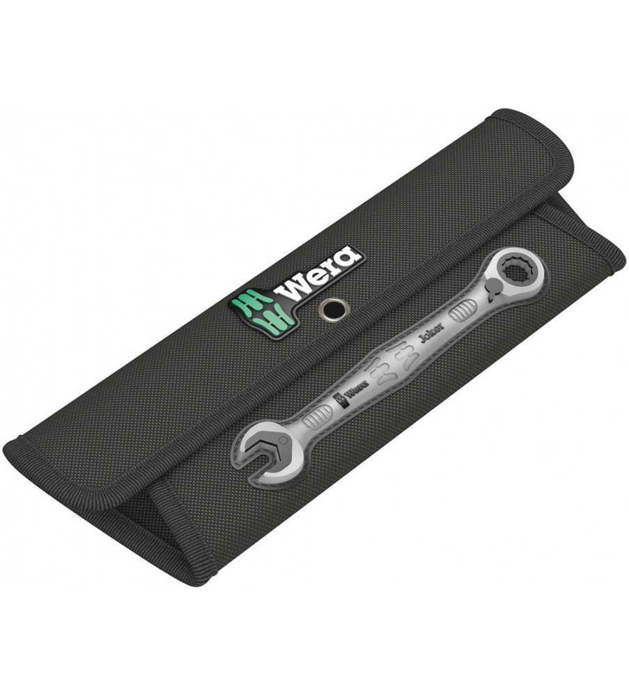 Hoogwaardige ringratel/steeksleutel-set van Wera: Alles wat een sleutel moet kunnen. En nog veel meer. Sneller, beter, mooier. Kortom: een echte Joker. De nieuwe generatie steek/ring-ratelsleutels. 4-delige set in robuust etui. Voor zeskant-schroeven resp. moeren. Met vasthoudfunctie via metalen plaat in bek, om het verliezen van schroeven en moeren te reduceren. De verwisselbare metalen plaat in de bek houdt met extra harde tanden schroeven en moeren en verkleint het risico op wegglijden. De geïntegreerde eindaanslag voorkomt het wegglijden naar beneden van de schroefkop en maakt hoge draaimomenten mogelijk. De intelligente dubbele zeskant-geometrie zorgt voor een sluitende verbinding met schroef of moer en reduceert zo het risico op wegglijden. Dankzij de terughaalhoek van slechts 30° aan de steeksleutelzijde behoort het tijdrovende omkeren van de sleutel tijdens het schroeven tot het verleden. Ratelmechanisme aan ringzijde met uiterst fijne vertanding (80 tanden) voor flexibiliteit, ook op plekken waar weinig plaats is. De speciale smeedvorm maakt overdracht hoge draaimomenten mogelijk en geeft het geheel een hoge buigstijfheid. Gemaakt van sterk chroom-molybdeen staal met nikkel-chroom coating voor een hoge bescherming tegen corrosie. Met 'Take it easy'-Toolfinder: Kleurcodering op grootte.