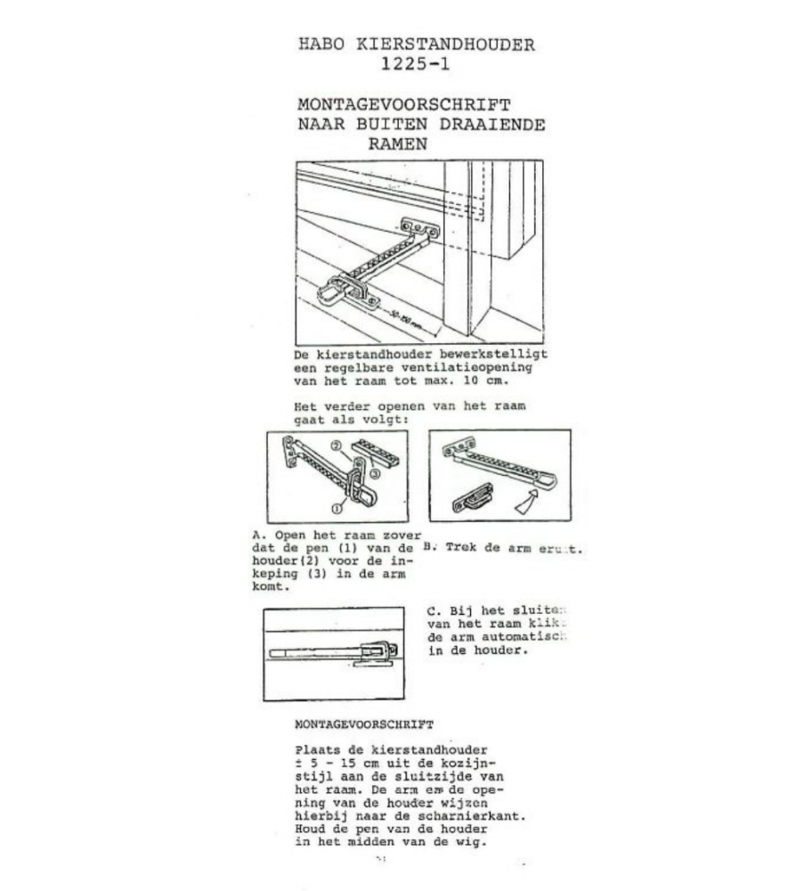 Habo 1225-1 kierstandhouder kunststof, voor naar buiten draaiende ramen, armlengte 147 mm, arm vast aan de voetplaat, is op één punt los te maken voetplaat.