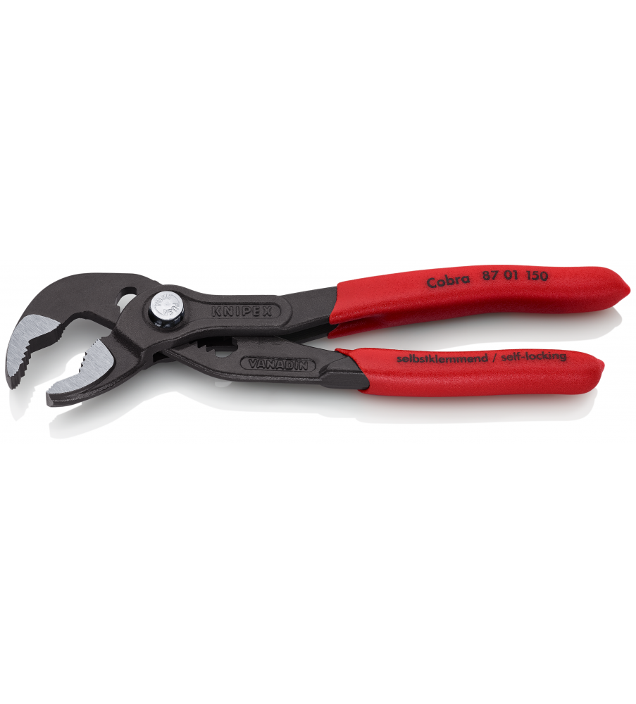 Instelling door druk op de knop direct op het werkstuk: snel en eenvoudig te hanteren. De fijne verstelling maakt het mogelijk de tang aan te passen aan de meest uiteenlopende afmetingen van werkstukken,prettige stand van de handgrepen. Aantal instelling zie tabel.. Het scharnier is gemakkelijk te verstellen waarna een gegarandeerde verbinding tot stand komt. Hoge stabiliteit dankzij dubbele geleiding. Zelfklemmend op buizen en moeren: glijdt niet van het werkstuk af en werkt krachtbesparend. Grijpvlakken met speciaalgeharde tanden, hardheid van de tanden ca. 61 HRC: steeds weer veilig grijpen dankzij hoge slijtvastheid. Met één hand verstelbaar. Klembeveiliging verhindert verwondingen. Gunstige hefboomwerking: optimale krachtoverbrenging. Chroom-Vanadium elektrostaal, in olie gehard en getemperd