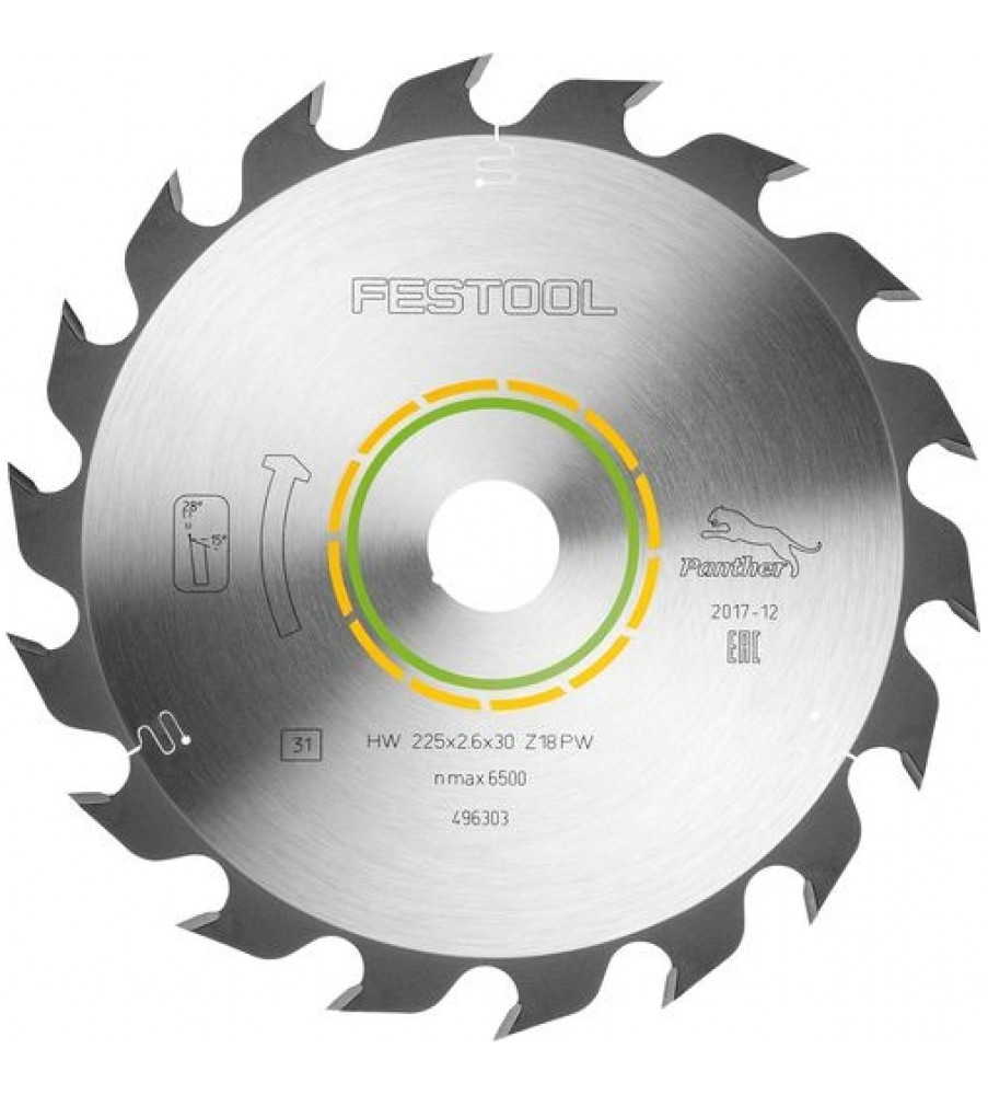 Diameter 225 mm; Zaagbreedte 2.6 mm; Asgat-Ø 30 mm; Aantal tanden 18; Spaanhoek 28 °; Tandvorm PW