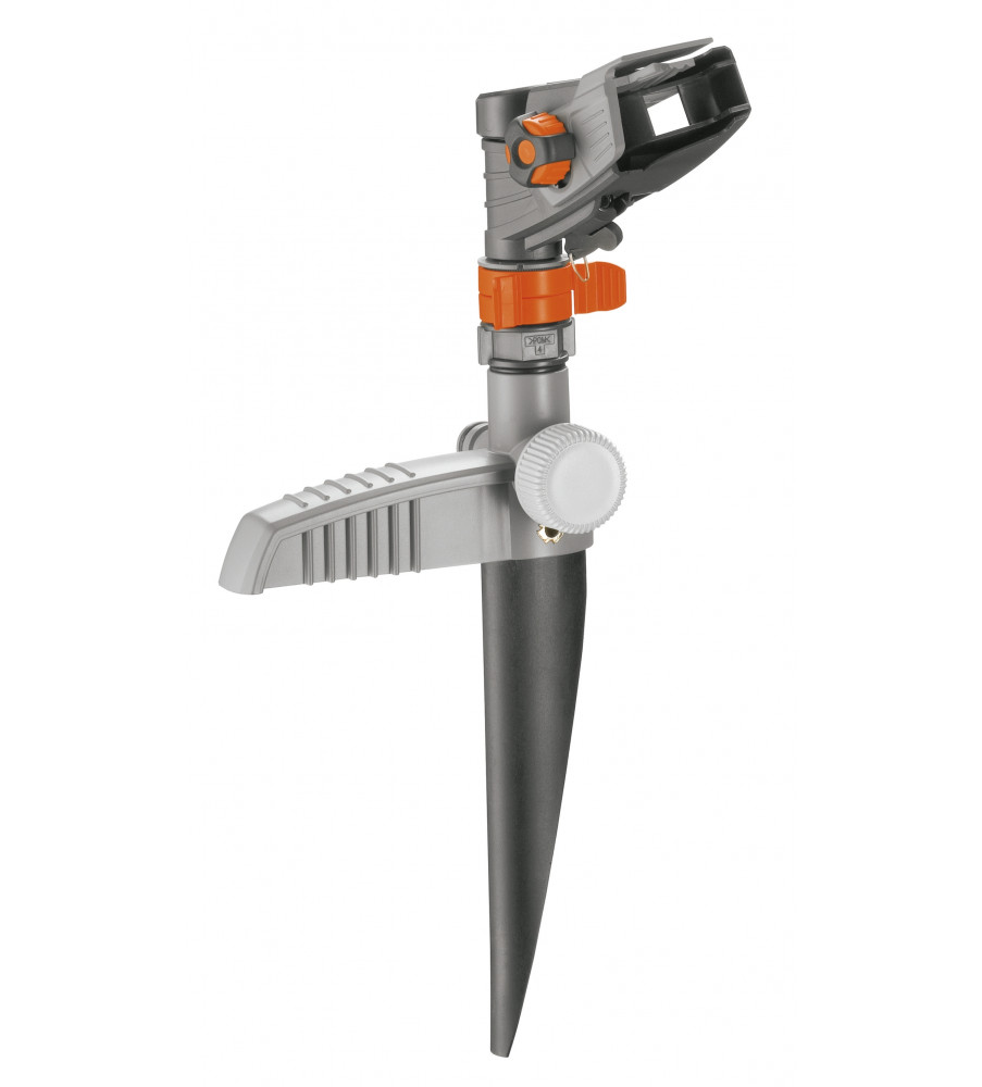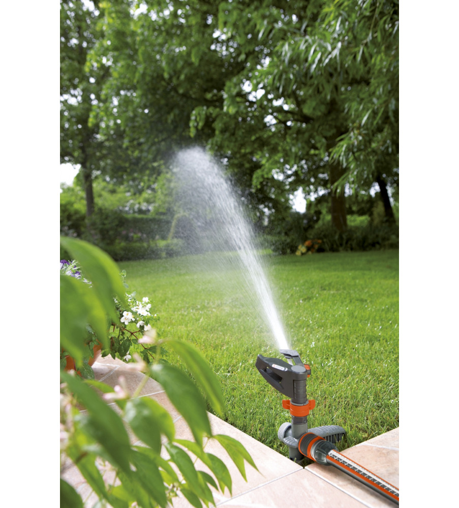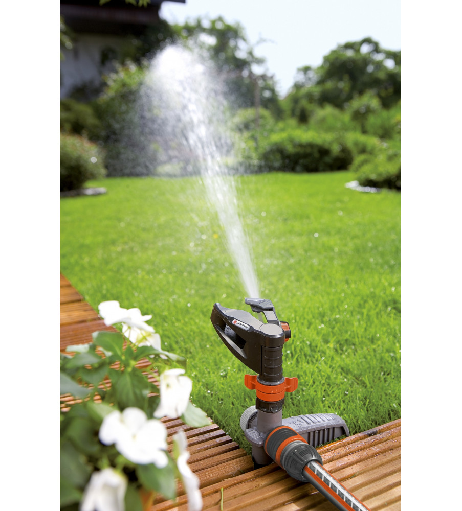 De pulserende sector- en cirkelsproeier heeft een stevig ontwerp van kunststof. Op de speciaal gemonteerde stelringen kunt u eenvoudig instellen welke sector er moet worden besproeid met fijne instelmogelijkheden van 25° tot 360°. De geselecteerde sector kan altijd vanaf deze stelringen worden bekeken. U kunt het bereik instellen met de grote, eenvoudig te gebruiken draaiknop. Dit kan worden ingesteld van 5 m tot maximaal 12,5 m. Er kan een oppervlak van 75 m² tot maximaal 490 m2 worden besproeid. De sproeier wordt op een kunststof spike gemonteerd. Hiermee kan de GARDENA Pulserende sector- en cirkelsproeier eenvoudig in het gazon worden geplaatst. En de sproeier kan net zo gemakkelijk weer ergens anders worden neergezet. De sproeier is voorzien van het verbindingsstuk en de einddop van het GARDENA System. U kunt het systeem meteen in uw tuin gebruiken. Als u een groter oppervlak wilt besproeien, koppelt u gewoon meerdere sproeiers aan elkaar. Voor gemakkelijke besproeiing van uw tuin.