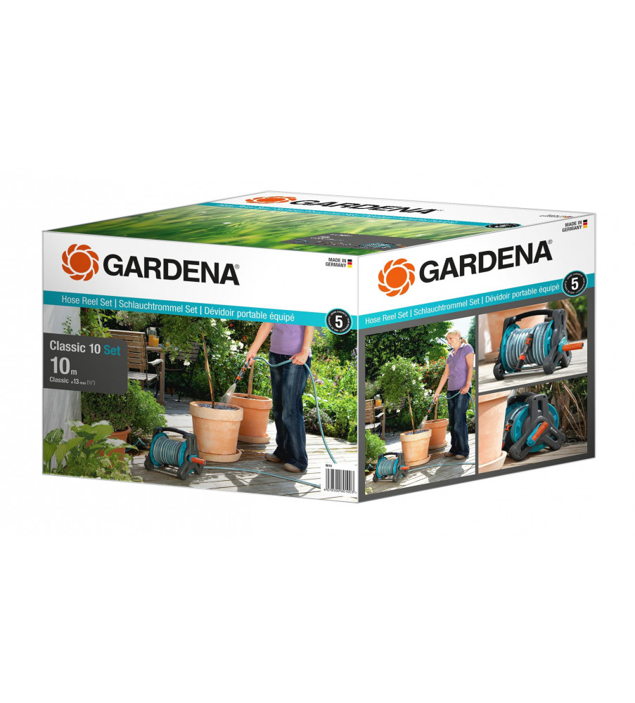 De GARDENA Classic slanghouderl 10 compleet is veelzijdig en compact. Door zijn geringe gewicht is hij eenvoudig te vervoeren en een slang is er veilig opgeborgen. De set is compleet gemonteerd en omvat een slanghouder, een 10 meter lange Classic slang met een diameter van 13 mm (1/2") en alle benodigde GARDENA System aansluitstukken: drie slangstukken (art.nr. 915), twee kraanstukken (art.nr. 900 en 902), een waterstop (art.nr. 913), een aansluitstuk (art.nr. 5305) en een Classic tuinspuit (art.nr. 8114). Daarom is hij ideaal voor zeer kleine tuinen, terrassen of balkons. Dankzij de ergonomische greep kunt u hem overal probleemloos naar toe brengen en gebruiken. Met de vrijlopende zwengel is deze slanghouder eenvoudig te bedienen. U kunt de zwengel ook inklappen. Zo kan de houder plaatsbesparend worden opgeborgen. De zijkanten van de slanghouder hebben de vorm van een driehoek en een laag zwaartepunt. Dat maakt hem bijzonder stabiel en hij zal niet snel kantelen. Zo wordt water geven veel leuker.