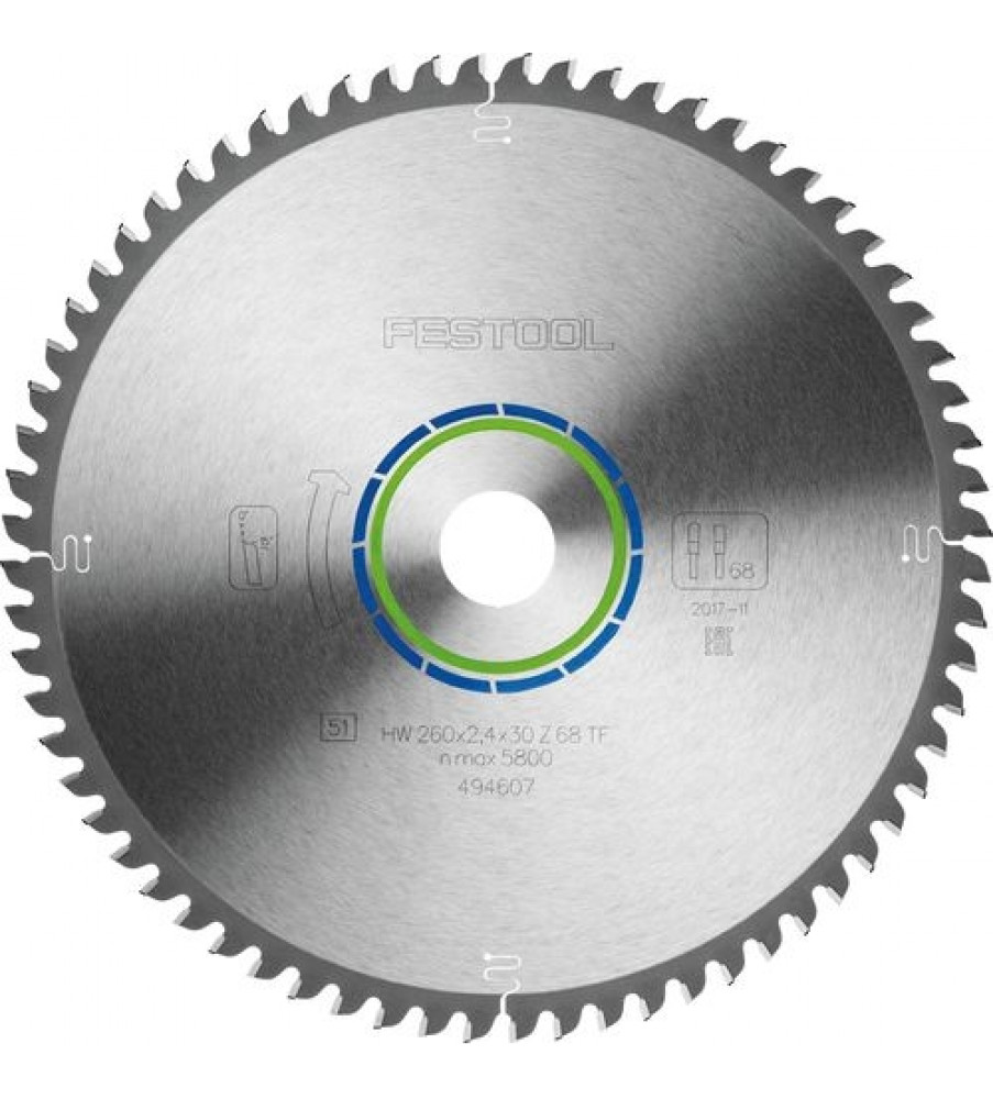 Diameter 260 mm; Zaagbreedte 2.4 mm; Asgat-Ø 30 mm; Aantal tanden 68; Spaanhoek 0 °; Tandvorm TF
