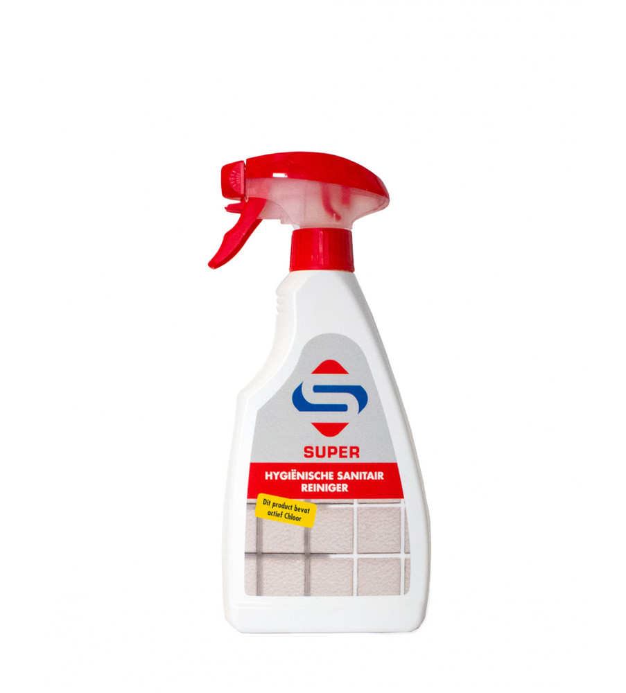 SUPER Hygiënische Sanitair Reiniger bevat actief chloor in een gebruiksvriendelijke spray. Vloeibaar, sterk alkalisch reinigingsmiddel met actief chloor. Hygiënisch reinigen van harde oppervlakken in o.a. sanitaire ruimtes. De ruimte hoeft niet droog te zijn, het product functioneert ook uitstekend in een vochtige omgeving. Sterk in het verwijderen van organische vervuilingen zoals: vetten, eiwitten, verkleuringen en zetmeel.