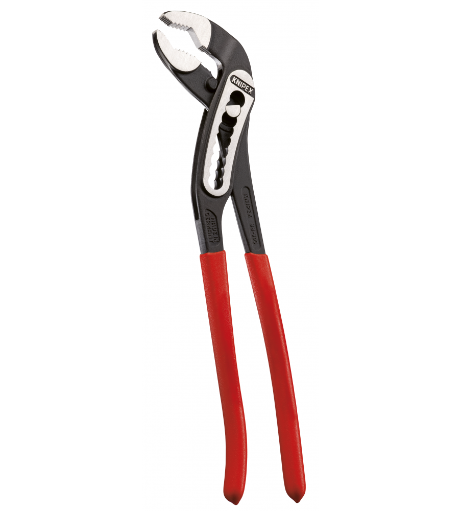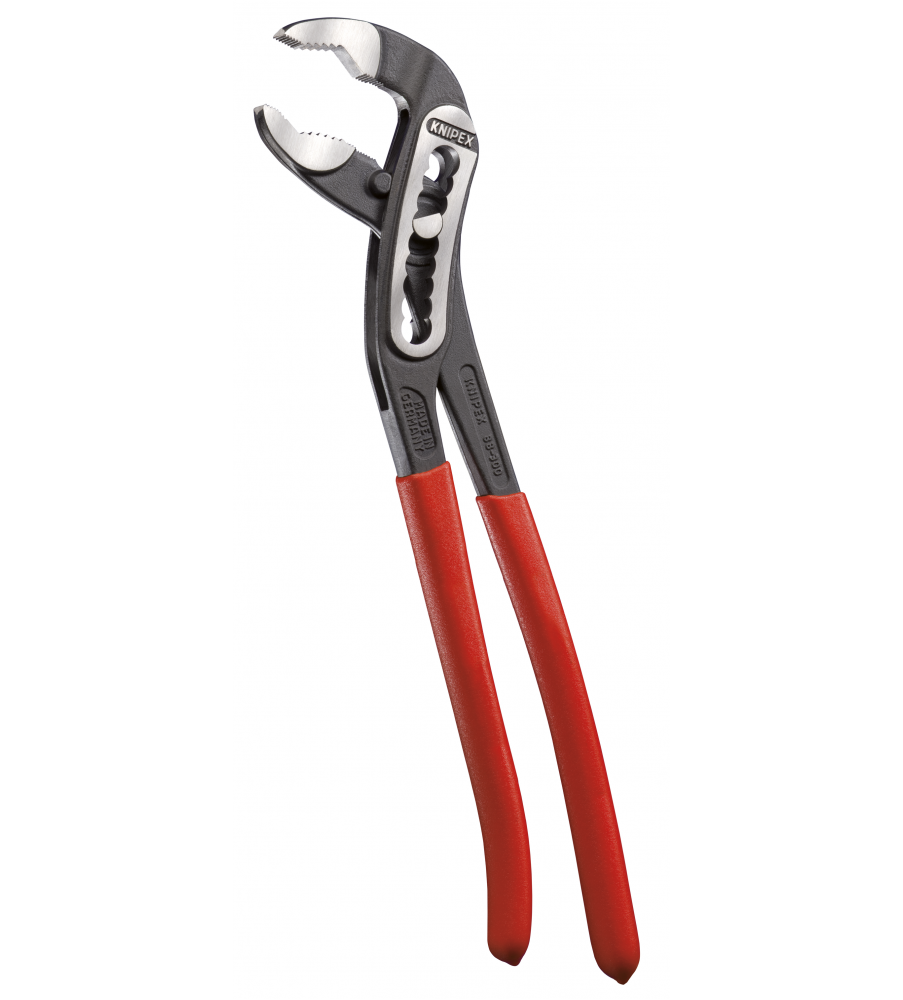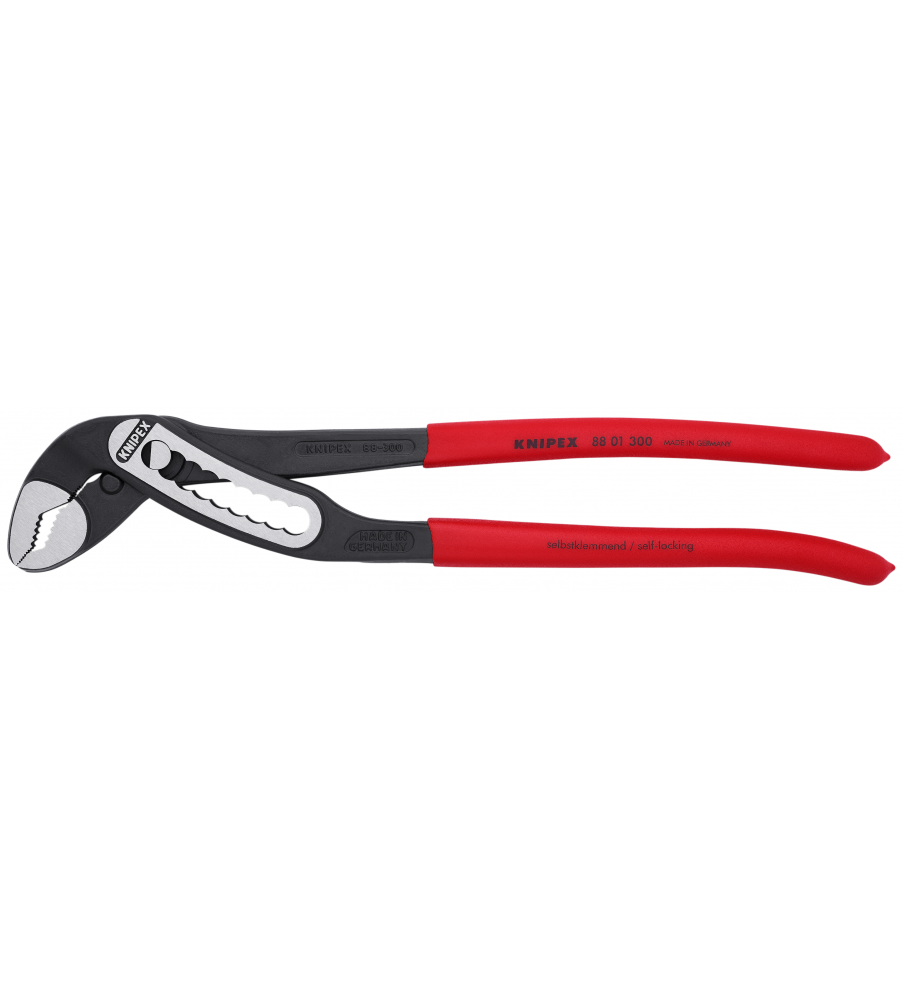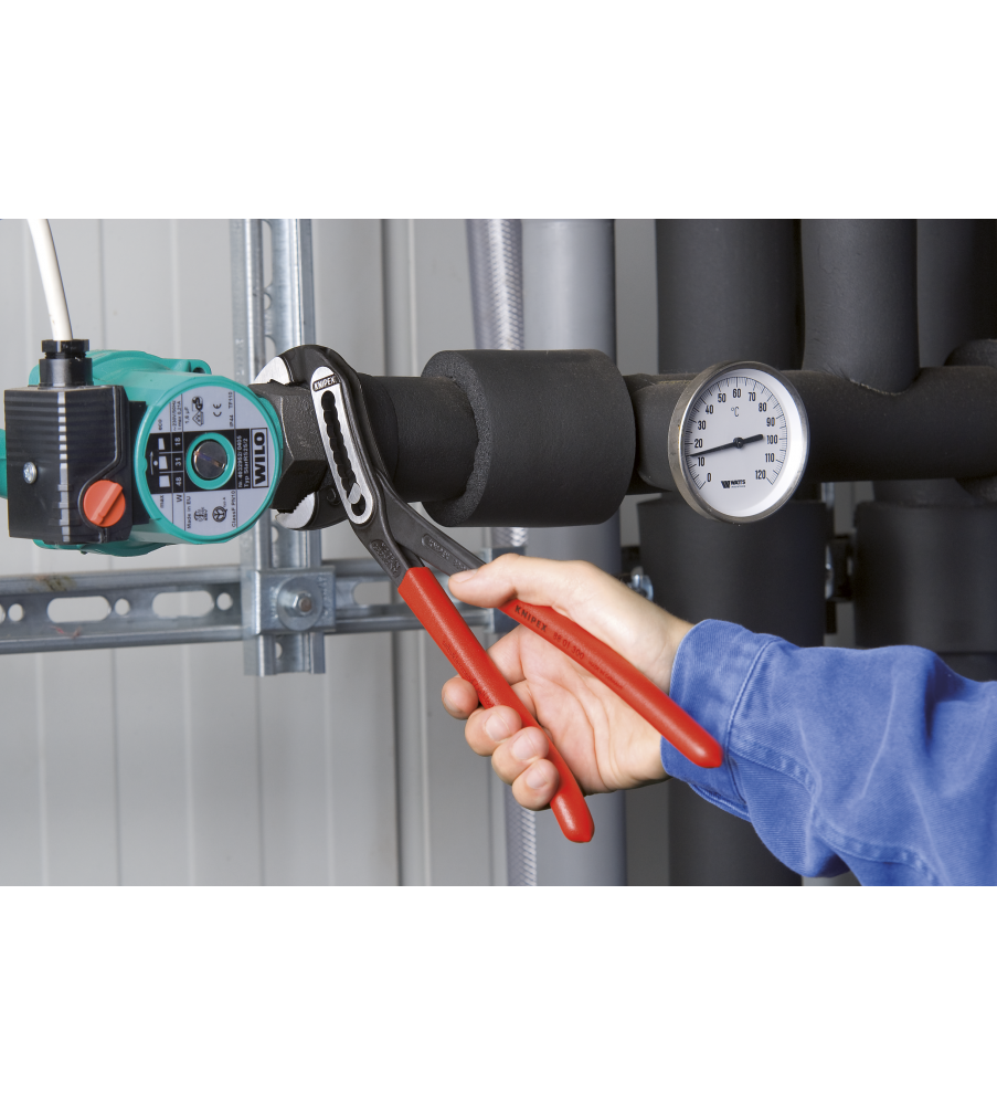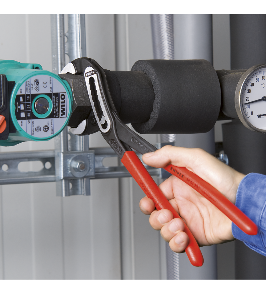 Hoge stabiliteit dankzij dubbele geleiding. Zelfklemmend op buizen en moeren: glijdt niet van het werkstuk af en werkt krachtbesparend. Klembeveiliging verhindert verwondingen. Gunstige hefboomwerking: optimale krachtoverbrenging. Grijpvlakken met speciaalgeharde tanden, hardheid van de tanden ca. 61 HRC: steeds weer veilig grijpen dankzij hoge slijtvastheid. Chroom-Vanadium elektrostaal, in olie gehard en getemperd.