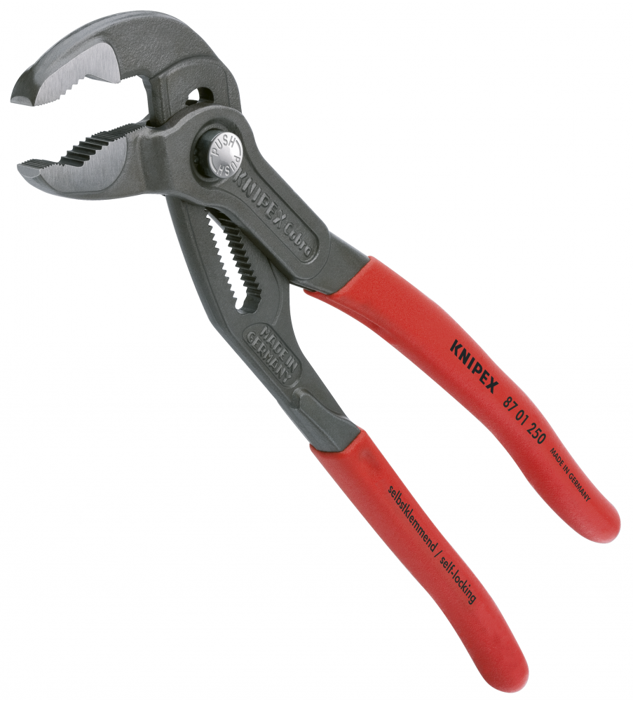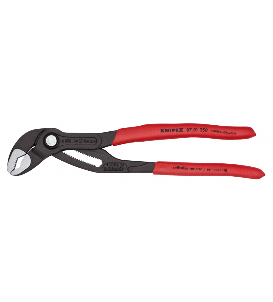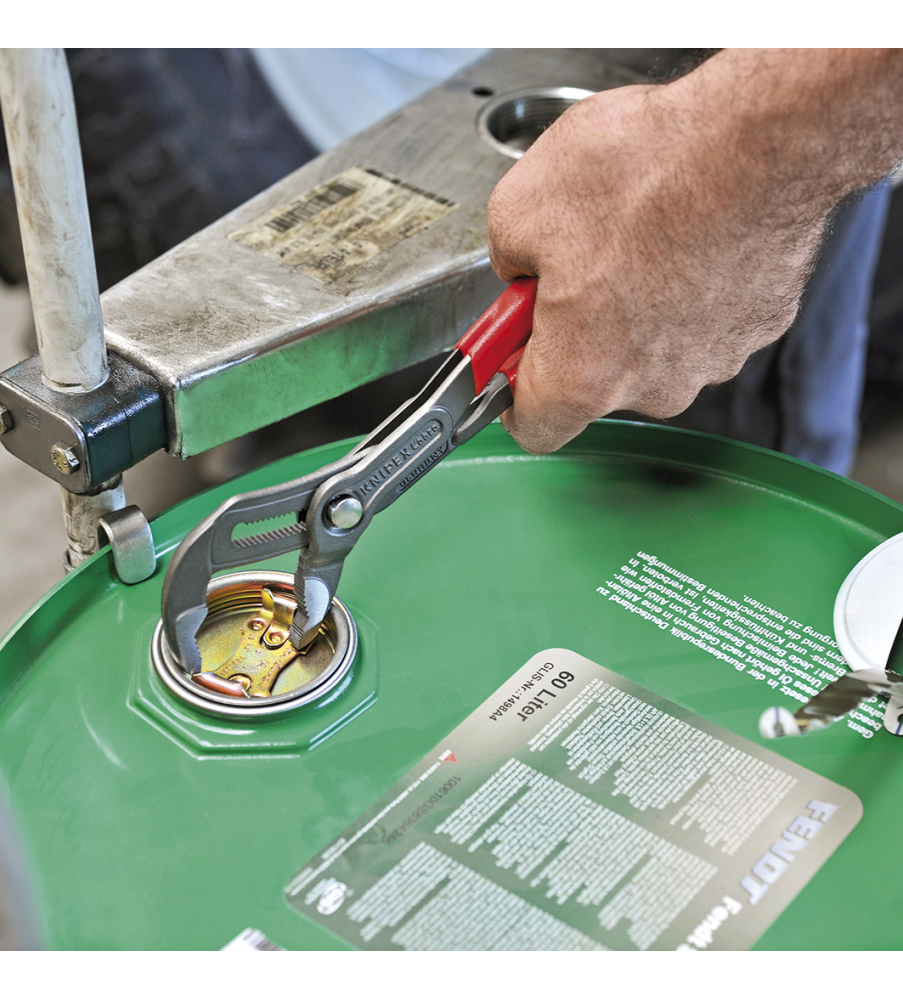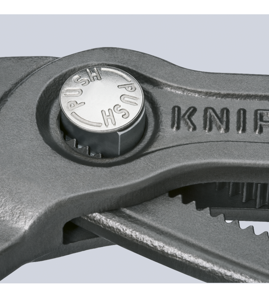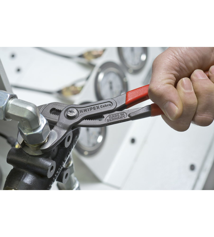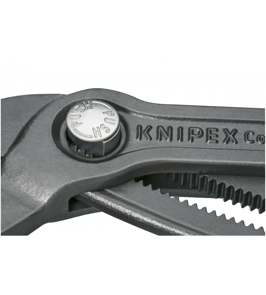 Instelling door druk op de knop direct op het werkstuk: snel en eenvoudig te hanteren. De fijne verstelling maakt het mogelijk de tang aan te passen aan de meest uiteenlopende afmetingen van werkstukken,prettige stand van de handgrepen. Aantal instelling zie tabel.. Het scharnier is gemakkelijk te verstellen waarna een gegarandeerde verbinding tot stand komt. Hoge stabiliteit dankzij dubbele geleiding. Zelfklemmend op buizen en moeren: glijdt niet van het werkstuk af en werkt krachtbesparend. Grijpvlakken met speciaalgeharde tanden, hardheid van de tanden ca. 61 HRC: steeds weer veilig grijpen dankzij hoge slijtvastheid. Met één hand verstelbaar. Klembeveiliging verhindert verwondingen. Gunstige hefboomwerking: optimale krachtoverbrenging. Chroom-Vanadium elektrostaal, in olie gehard en getemperd Lengte: 250 mm: Bijzonder grote capaciteit om te grijpen. Goede toegang to het werkstuk. Hoge belastbarheid en slanke vorm.