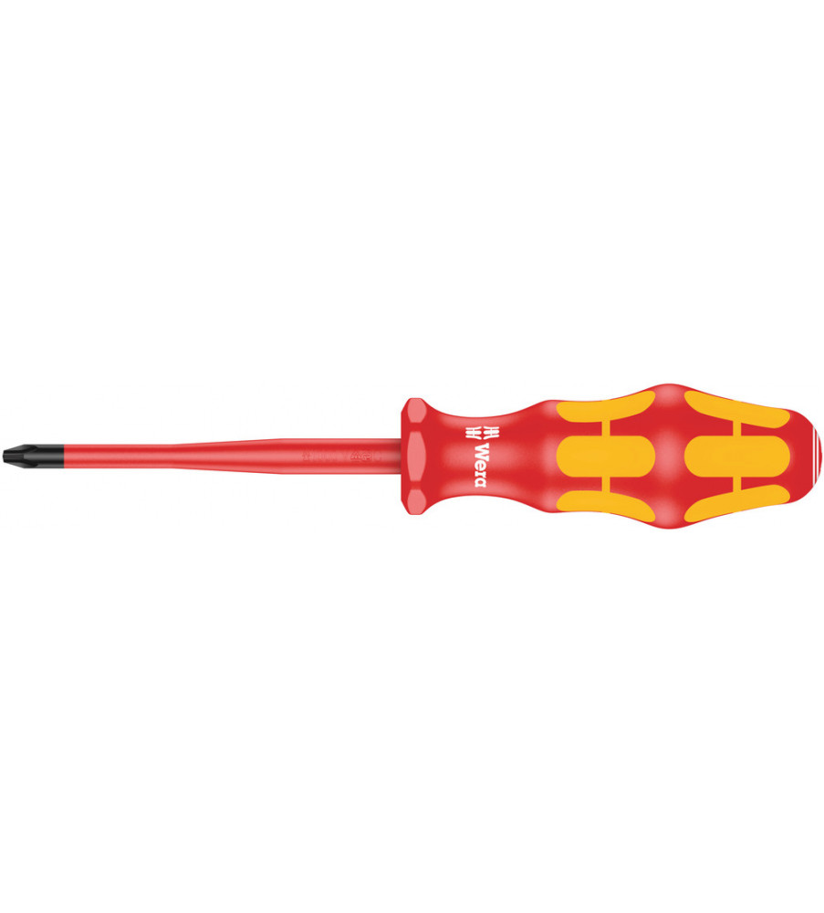 Wera VDE schroevendraaier met meercomponenten Kraftform handgreep voor snel en veilig werken: Harde gripzones voor een hoge werksnelheid, zachte gripzones voor een hoge draaimomentoverbrenging. Individueel getest bij 10.000 V voor veilig werken bij de toegelaten spanning van 1.000 V. Gereduceerde klingdiameter, om ook diepliggende schroeven makkelijk te kunnen bereiken. "Take it easy toolfinder" met kleurcodering op profiel en maatcode - voor het eenvoudig en snel vinden van het benodigde gereedschap. Zeskantige wegrolbescherming verhindert telkens wegrollen op de werkplek.