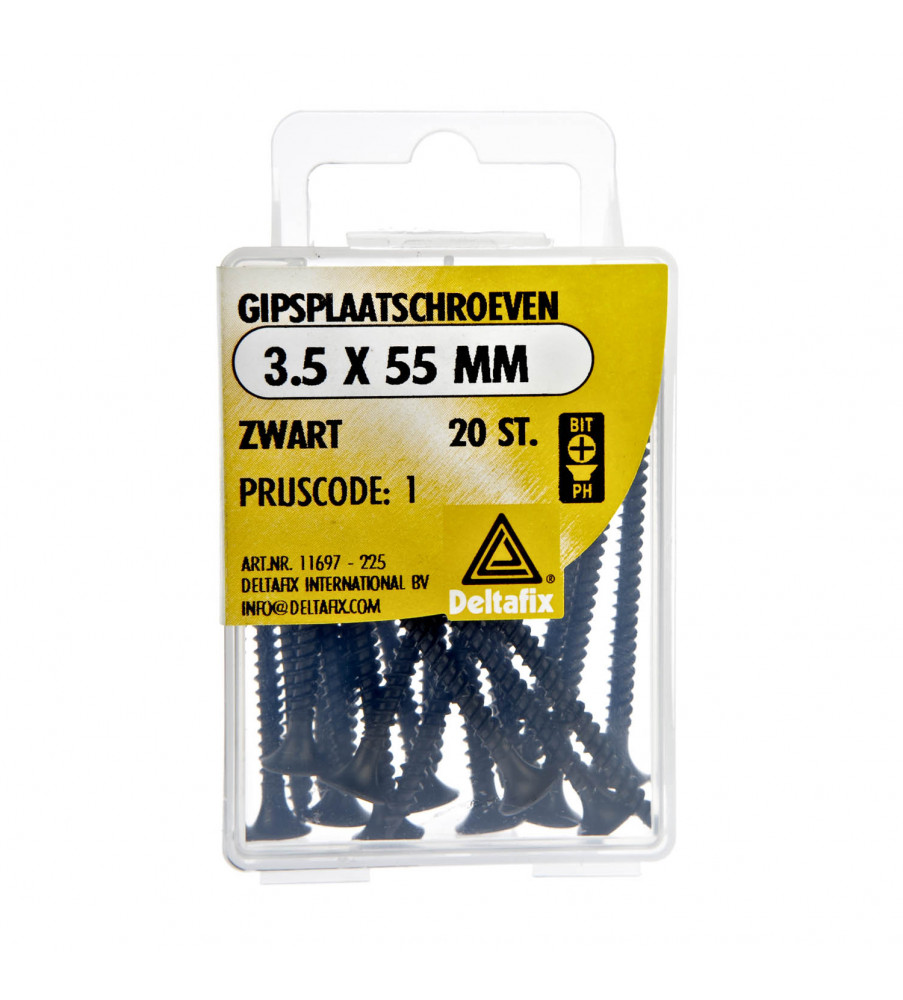 Gipsplaatschroeven of snelbouwschroeven zijn onmisbaar voor het bevestigen van gipsplaten. Deze zwarte schroeven lijken op spaanplaatschroeven, maar verschillen wel degelijk. Gipsplaatschroeven hebben een trompetkop om beschadigingen aan de gipsplaat te voorkomen. Bovendien blijft het karton mooi achter de kop klem zitten. Spaanplaatschroeven hebben een conische kop, waardoor de kop door het karton heengaat en alleen het gips vasthoudt. De spoed van een gipsplaatschroef is bovendien fijner dan die van een spaanplaatschroef. Deze schroeven hebben een Philips-kruiskop. Gebruik daarom altijd een PH schroevendraaier (of schroefbit). De zwarte kleur van de schroeven komt door een chemisch proces dat een laag onoplosbare fosfaten op een metaaloppervlak aanbrengt. Door het fosfateren bevat de toplaag van de schroeven geen metaal meer. Dit voorkomt roesten na het aanbrengen van stucwerk of latex. Deze schroef is te gebruiken in hout, houtvezelplaten en kunststof.- CE-markering